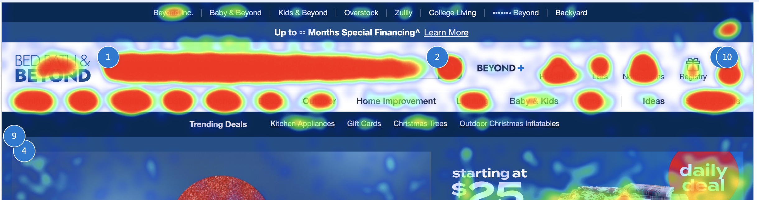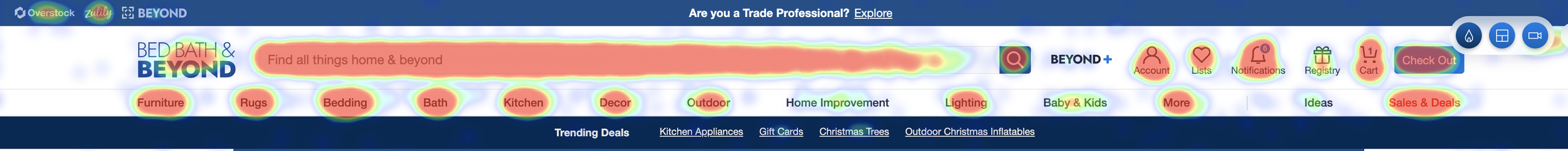 Heat map of desktop control brand bar usage. We saw a decent amount using the Beyond Inc. link which came first in the list. This was not ideal as this may be driving traffic away from our site to an avenue that does not drive any product sales.