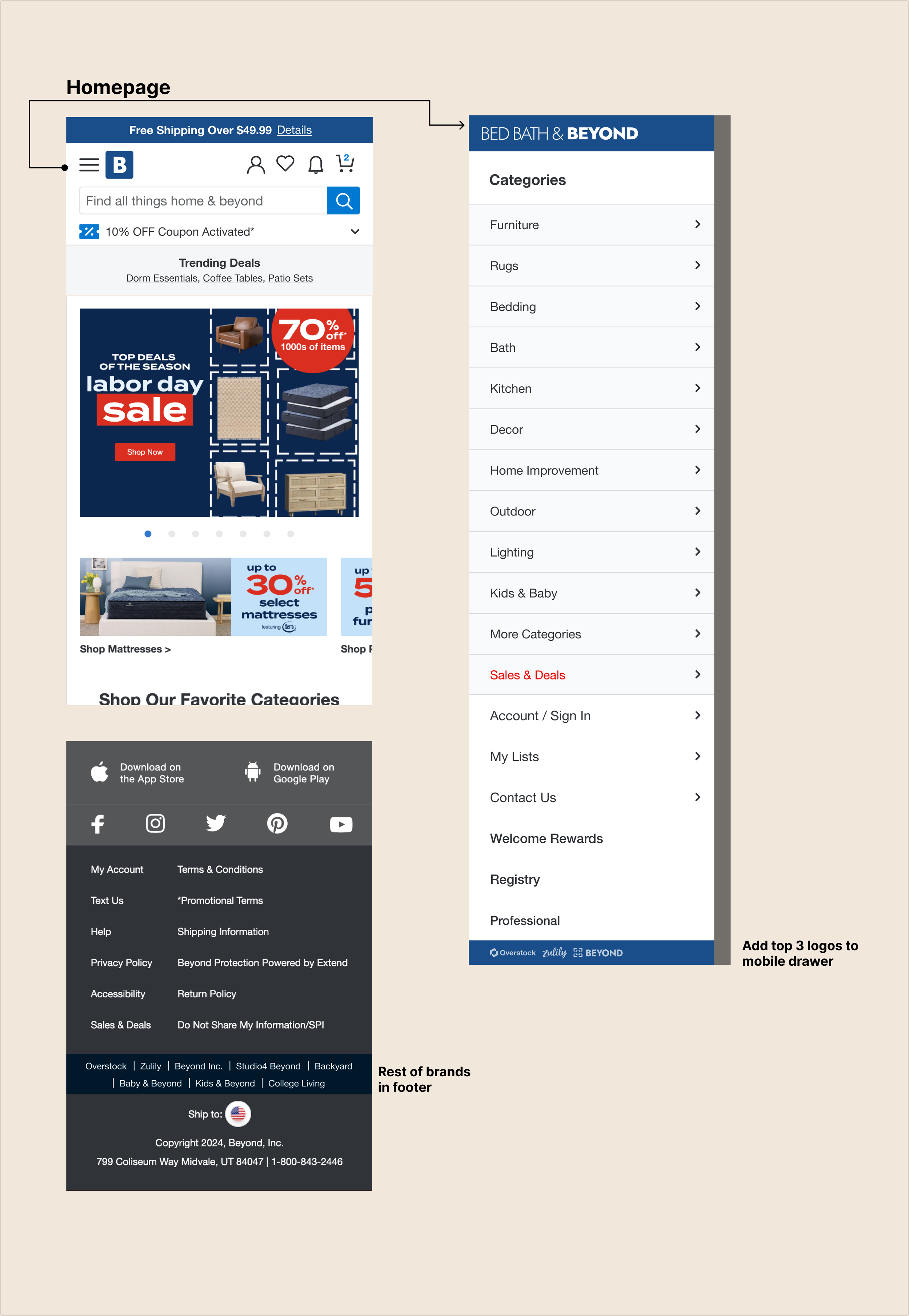 After the purchase of Bed Bath & Beyond’s IP (intellectual property), the re-introduction of Overstock.com, and several other websites BB&B had a brand awerness issue. Leadership wanted to use key space on our main website to showcase our other brands and drive traffic to them.