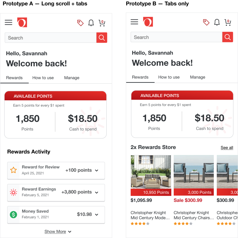 Prototype A (long scroll), hands down, offered a clearer more discoverable path to understanding all the ways a customer can earn points.