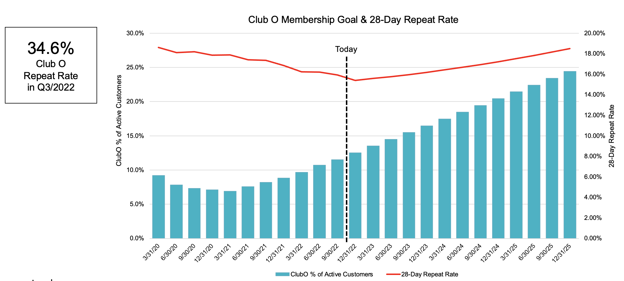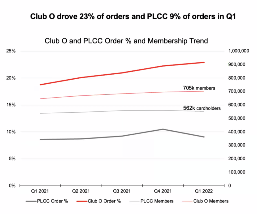 In Q4 2021 when the new Club O launched the Order % (red line) begins to trend up as well as our member rate to approximately 705K members in Q1 2021.